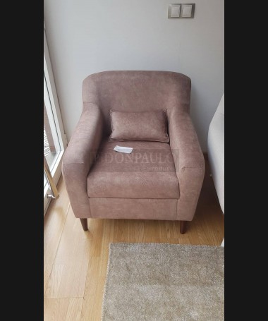 - Sillón modelo ESO0037, tapizado en tela de fácil limpieza, referencia Nagay (descatalogada), con asientos fijos, patas de madera, de L68 x F70 x A77 cm