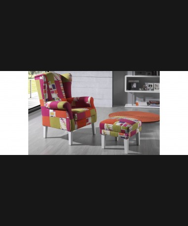 - Sillón modelo PSO0018, de estilo clásico hecho a medida, de tipo orejera, tapizado en tela de fácil limpieza, con banqueta a juego y patas lacadas en blanco