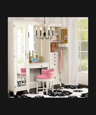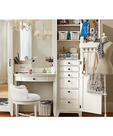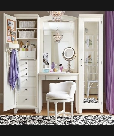 - Tocador modelo PTO0003, de estilo clásico hecho a medida, con armarios a los lados, espejo y banqueta a juego, lacado en blanco