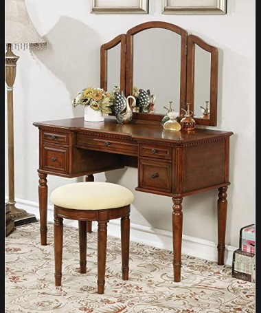 - Tocador modelo PTO0013, de estilo clásico hecho a medida, en madera tallada, con espejo y taburete a juego