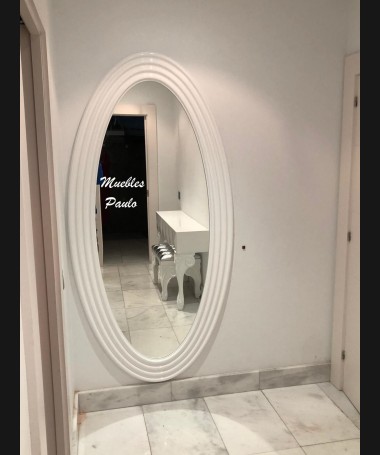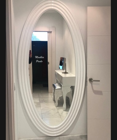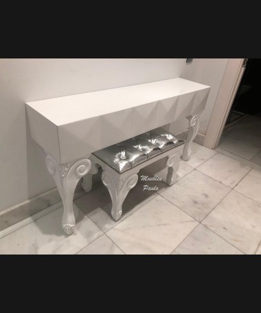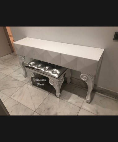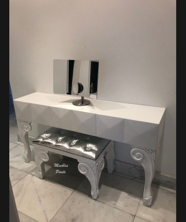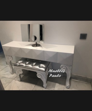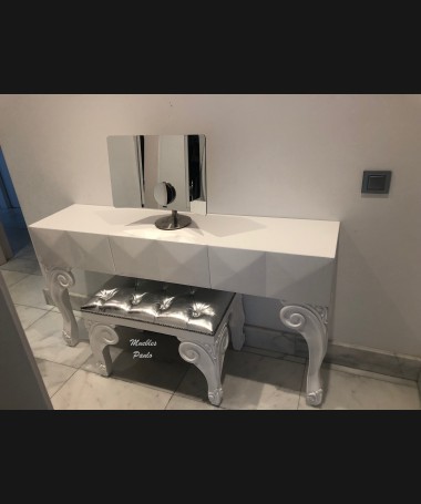 - Tocador modelo TTO0003, lacado en blanco alto brillo con espejo a juego, hecho a medida, con banqueta a juego