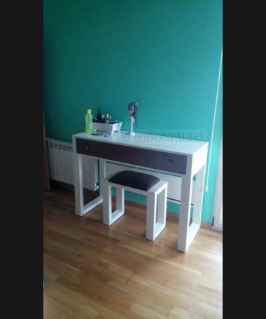 - Tocador modelo TTO0004, hecho a medida, en madera de castaño en acabado decapado blanco con el frente en decapé blanco, la tapa de arriba se are para meter un teclado dentro; banqueta a juego