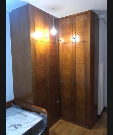 - Armario modelo TAR0120, de estilo clásico hecho a medida, en forma de "L", en madera de castaño, con puertas de apertura, y la distribución personalizada