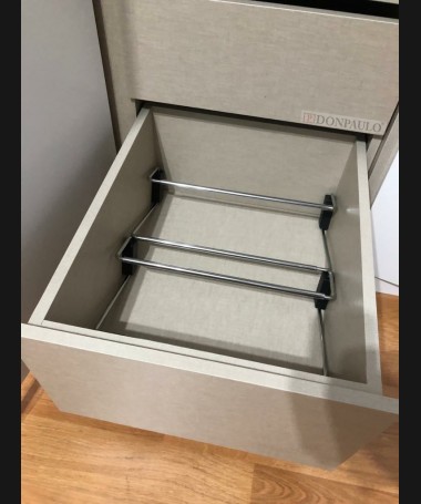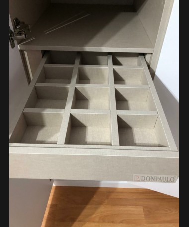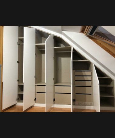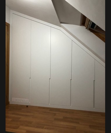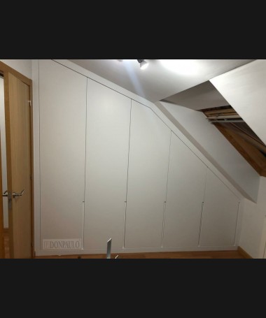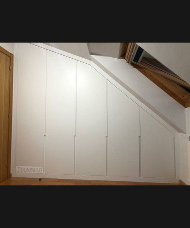 - Armario modelo TAR0132, de estilo moderno hecho a medida, fabricado en dm hidrófugo lacado en blanco mate, con el interior en melamina textil personalizado, en forma de bajo-cubierta, las guías y las bisagras con frenos