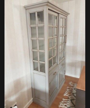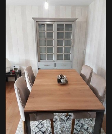 - Comedor modelo TCO0053, de estilo clásico hecho a medida, en madera, en acabado color madera y gris, compuesto por: mesa de comedor, cuatro sillas y vitrina