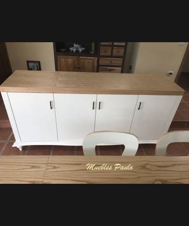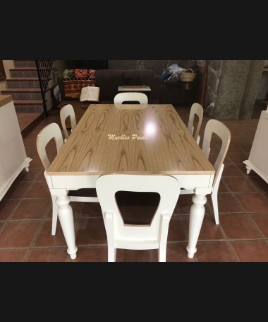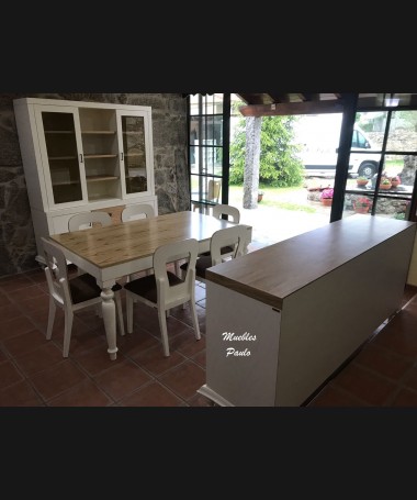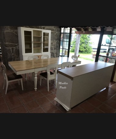 - Comedor modelo TCO0056, de estilo clásico hecho a medida, en madera de castaño en acabado decapado blanco con detalles en color natural. Compuesto por mesa de comedor extensible, 6 sillas tapizadas en tela de fácil limpieza aparador y alacena a juego