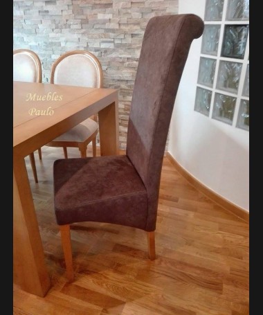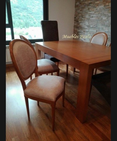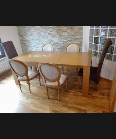 - Comedor modelo TCO0073, de estilo moderno hecho a medida, fabricado en madera de castaño en acabado color roble, compuesto por mesa de comedor extensible por la pata, con 6 sillas en dos modelos diferentes tapizadas en tela de fácil limpieza