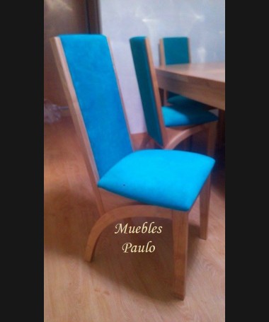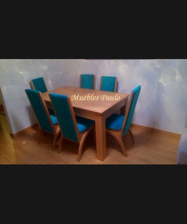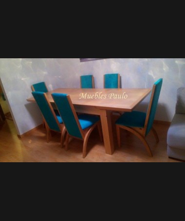 - Comedor modelo TCO0080, de estilo moderno hecho a medida, en madera de castaño, compuesto por mesa de comedor extensible y 6 sillas tapizadas en tela color turquesa