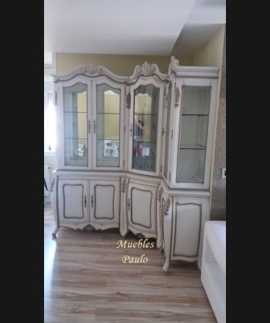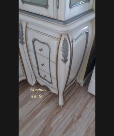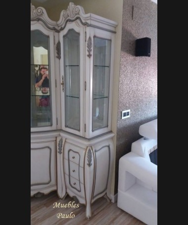 - Vitrina modelo TAL0040, de estilo clásico hecho a medida, en madera de cerezo en acabado efecto anticuario blanco roto, con detalles en gris y dorado