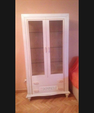- Vitrina modelo TAL0062, de estilo clásico hecha a medida, en madera de castaño en acabado decapado blanco con la beta dorada y detalles dorados