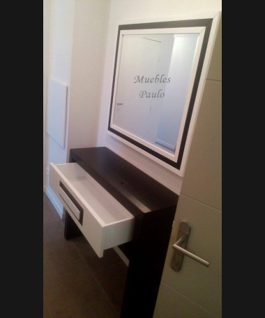 - Consola con espejo modelo TAP0084, de estilo moderno hecha a medida, fabricada en madera en acabado decapado negro con detalles en blanco