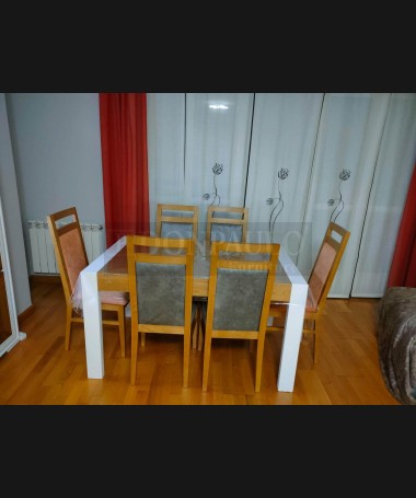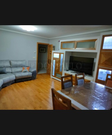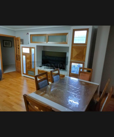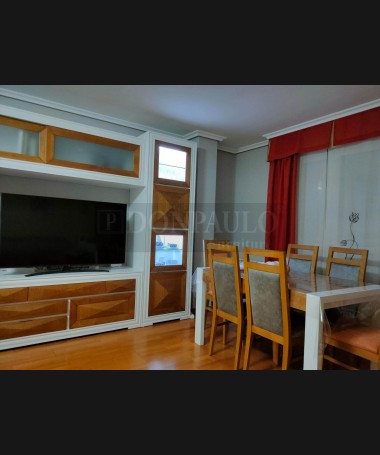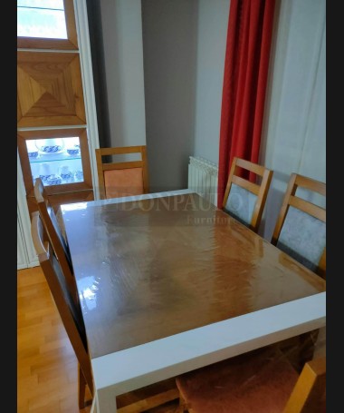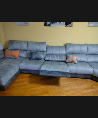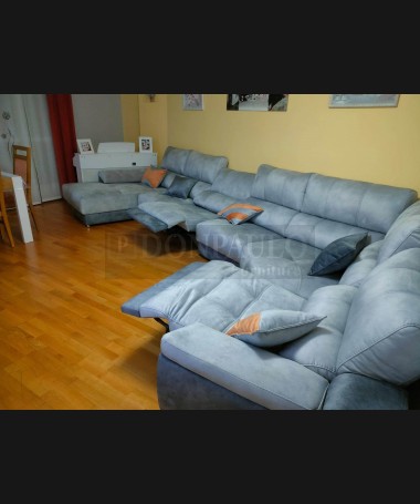 - Salón modelo TSA0058, de estilo moderno hecho a medida, en madera de castaño en acabado decapado blanco con detalles en color roble, compuesto por mueble de salón, mesa de comedor extensible, y sofá rinconera a medida tapizado en tela de fácil limpieza