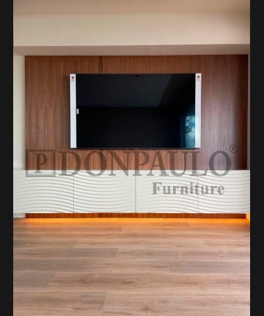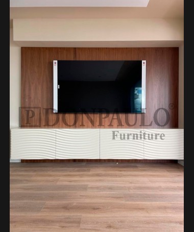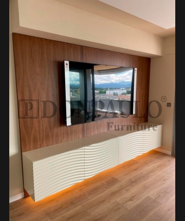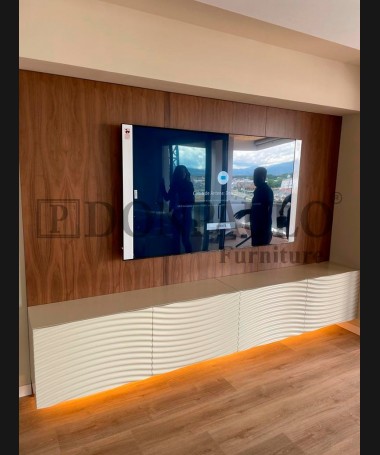 - Salón modelo TSA0060, de estilo moderno hecho a medida, en dm hidrófugo lacado en blanco, con luces de madera y panel de nogal trasero