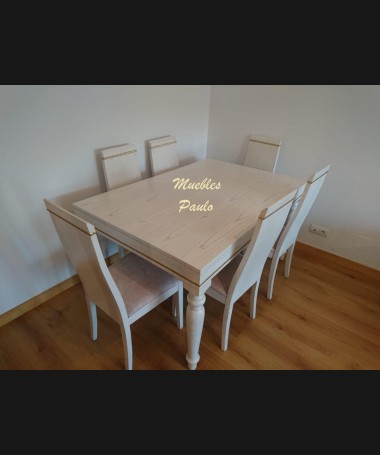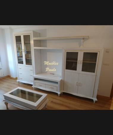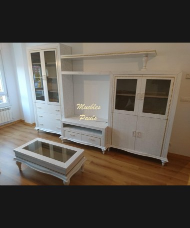 - Salón modelo TSA0076, de estilo moderno hecho a medida, en madera en acabado decapado blanco con la beta dorada, con detalles en dorado, con mesa de centro y comedor a juego