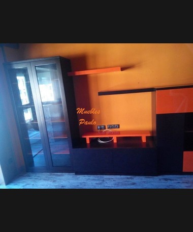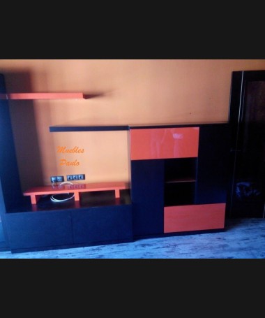 - Salón modelo TSA0084, de estilo moderno hecho a medida, en madera en acabado decapado negro con detalles lacados en naranja