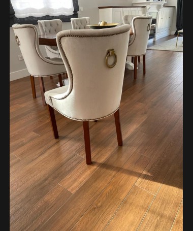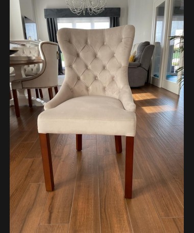 - Silla modelo TS0039, de estilo moderno, en madera de palisandro, tapizada con efecto capitoné en tela beige de fácil limpieza y con detalles de tachuelas en metal dorado.