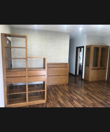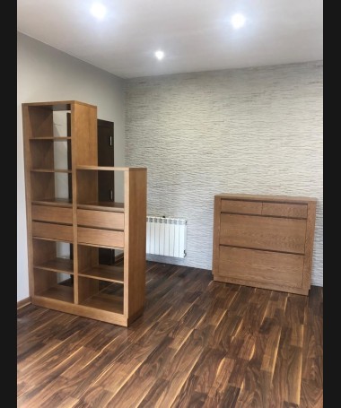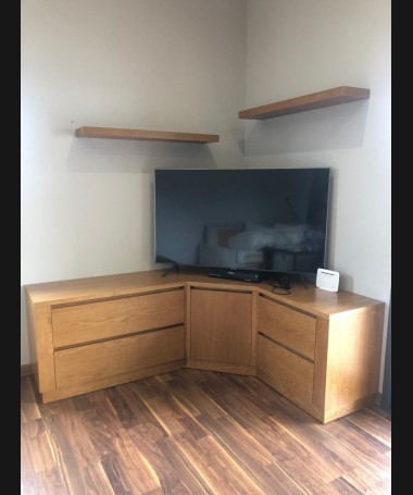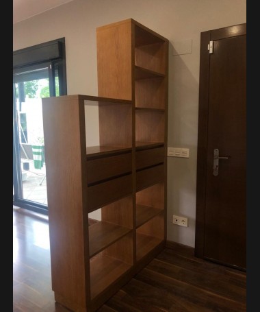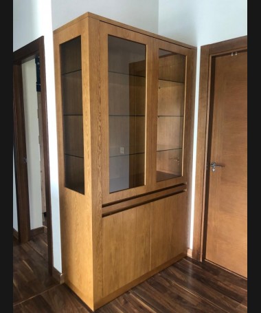 - Salón modelo TSA0106, de estilo moderno hecho a medida, en madera de castaño en color roble, compuesto por mueble TV, vitrina y estantería a juego.
